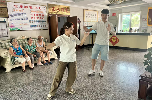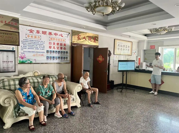 老年病防治宣讲是本次实践活动的重要组成部分,也是最为暖心的环节。2025年7月11日上午,实践队员怀着守护老人健康的初心与信念,前往烟台市福山区金东社区养老服务中心,为老人送去实用的养生知识。宣讲中,队员用通俗语言讲解养生意义,让老人理解并融入日常,还针对饮食习惯给出合理健康建议,将科学养生理念传递给老人,助力“治未病”理念深入人心。最后,队员为老人送上精心制作的香囊和特制足浴包。